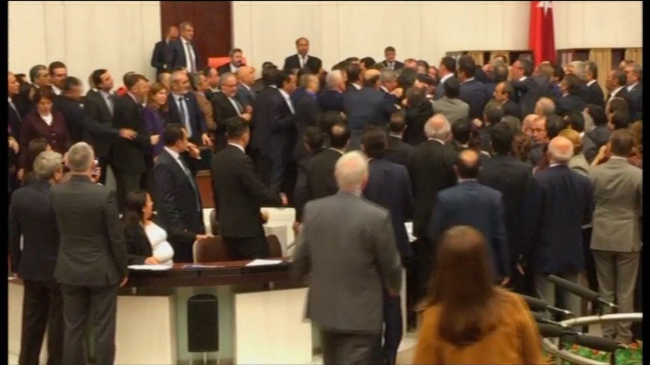 El choque empezó cuando diputados del principal partido de la oposición, el socialdemócrata CHP, filmaron cómo los legisladores del gubernamental AKP (islamista) votaban de forma pública, pese a que la Constitución establece que el voto debe ser secreto en este tipo de procesos.