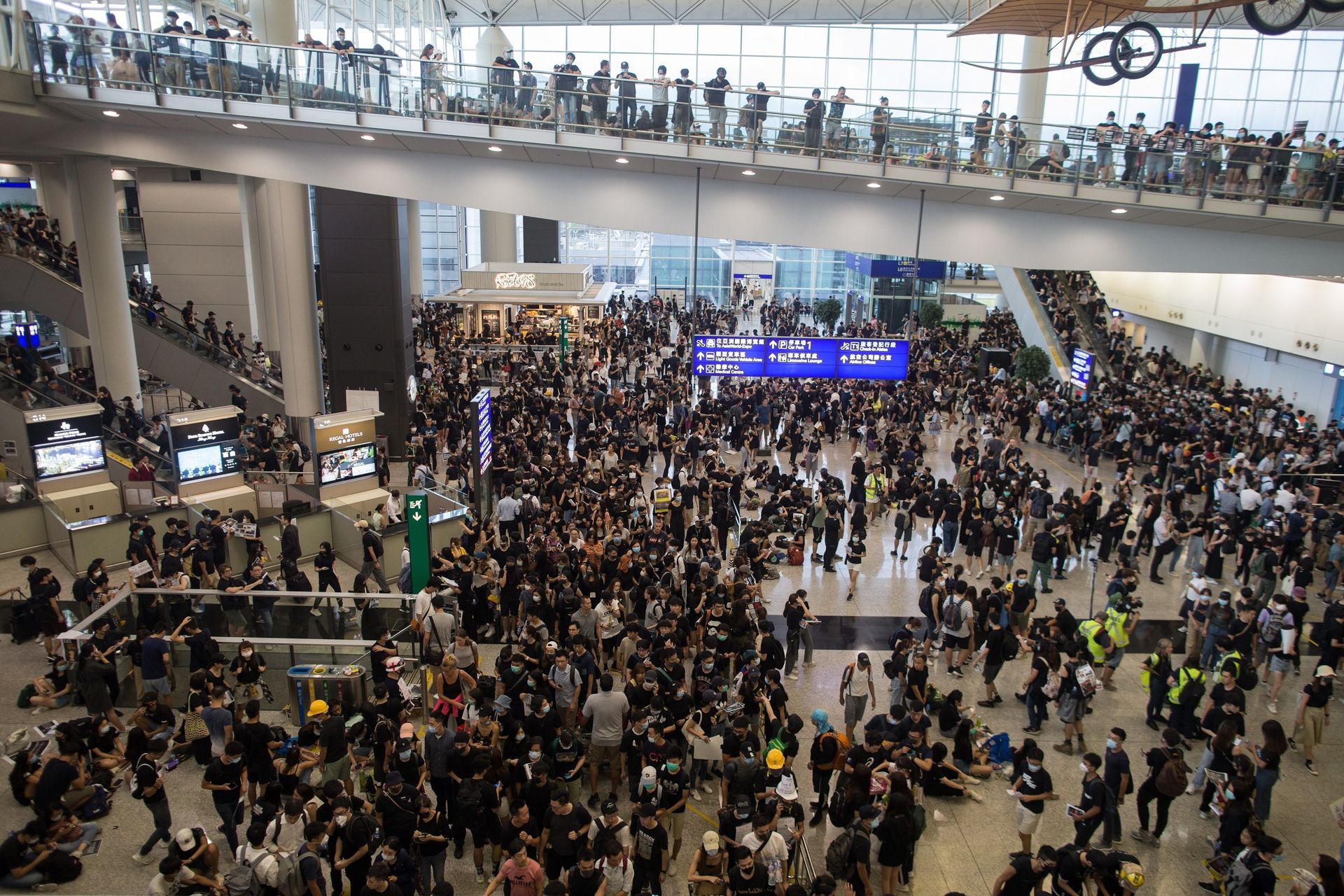 Por su parte, los medios oficiales chinos aseguran que los manifestantes habían llenado la terminal del aeropuerto por cuarto día consecutivo, provocando esta inusual medida. El sábado, cientos de manifestantes también hicieron noche en la terminal de llegadas vieron cómo otros se les unían hasta alcanzar el millar de personas, que entregaban folletos y octavillas para tratar de concienciar a los visitantes extranjeros sobre la crisis hongkonesa.