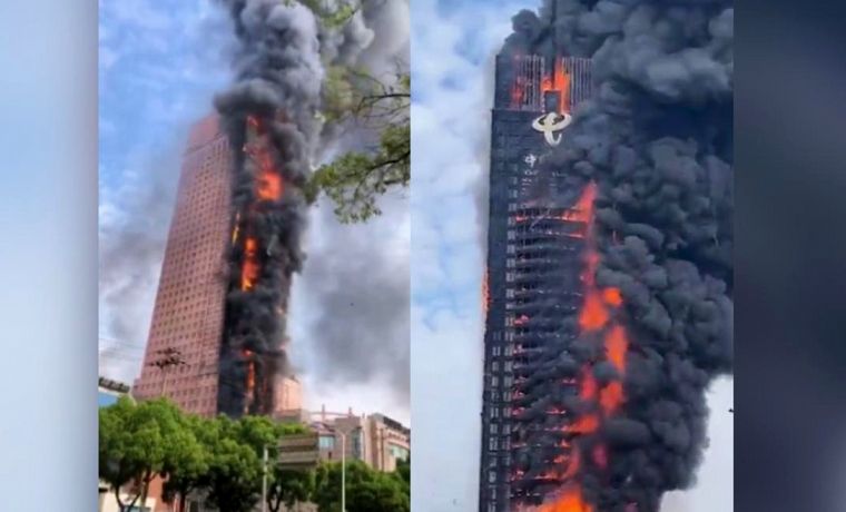 Fotos publicadas por CCTV muestran cómo las llamas devoran parte del rascacielos mientras que una densa columna de humo se eleva sobre la ciudad, donde residen unos 10 millones de habitantes.