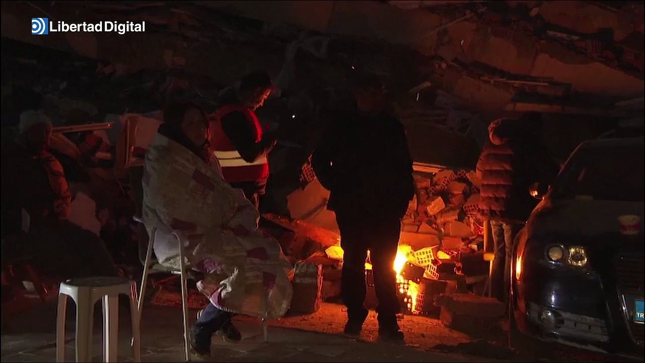 Miles de afectados por los terremotos se preparan para pasar otra noche a la intemperie. El calor de una hoguera es para muchos el único recurso para hacer frente a temperaturas que pueden alcanzar los 10 grados bajo cero. Son ya cuatro noches así. Algunos aguardan junto a los escombros de sus viviendas a la espera del rescate de sus familiares.