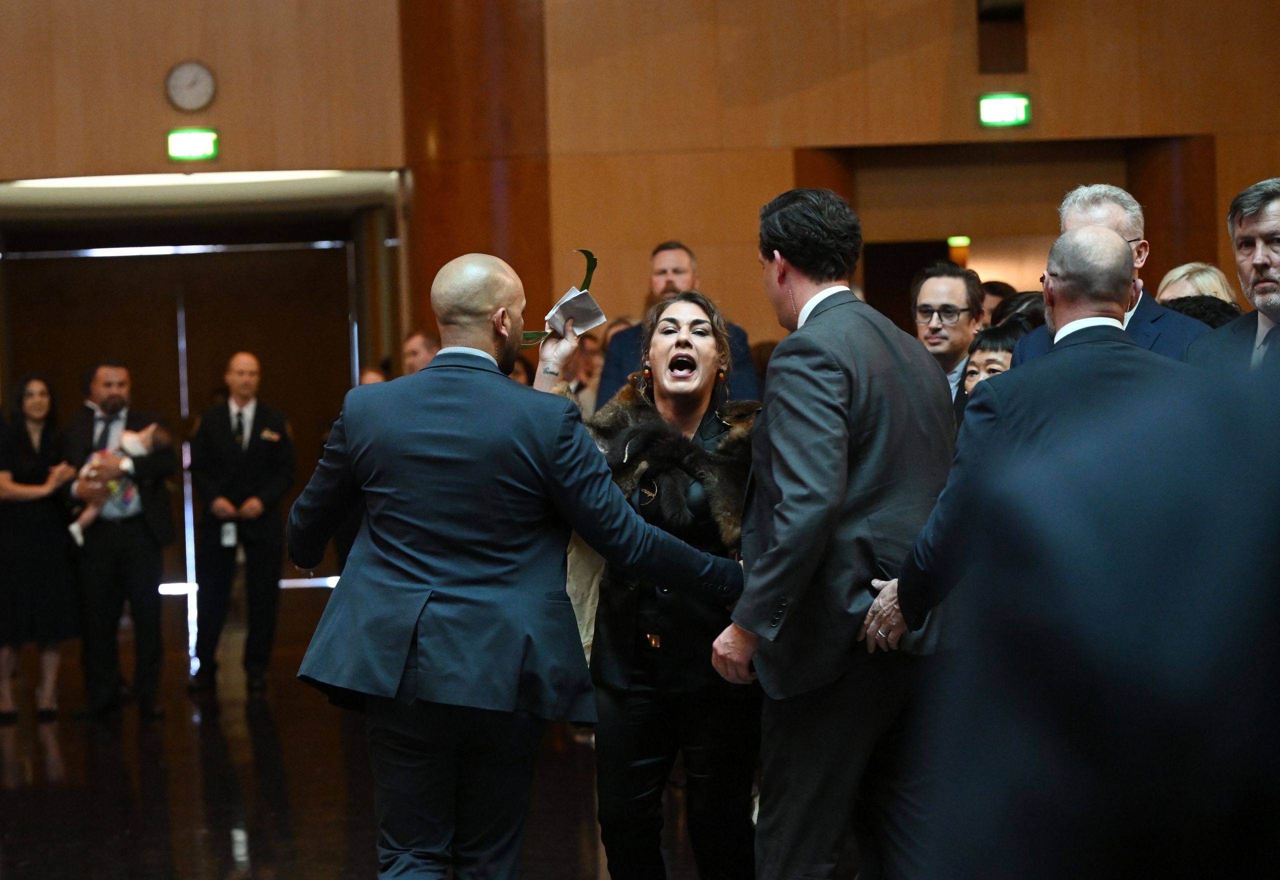 En las imágenes se observa a la mujer, perteneciente linaje de mujeres del movimiento indígena australiano, con una capa de piel de animal andando por la sala, dirigiéndose y señalando al monarca mientras da su alegato. Rápidamente, los escoltas le acompañan a la salida, mientras ella continúa su reflexión y el rey permanece sentado junto a su esposa, la reina Camila.