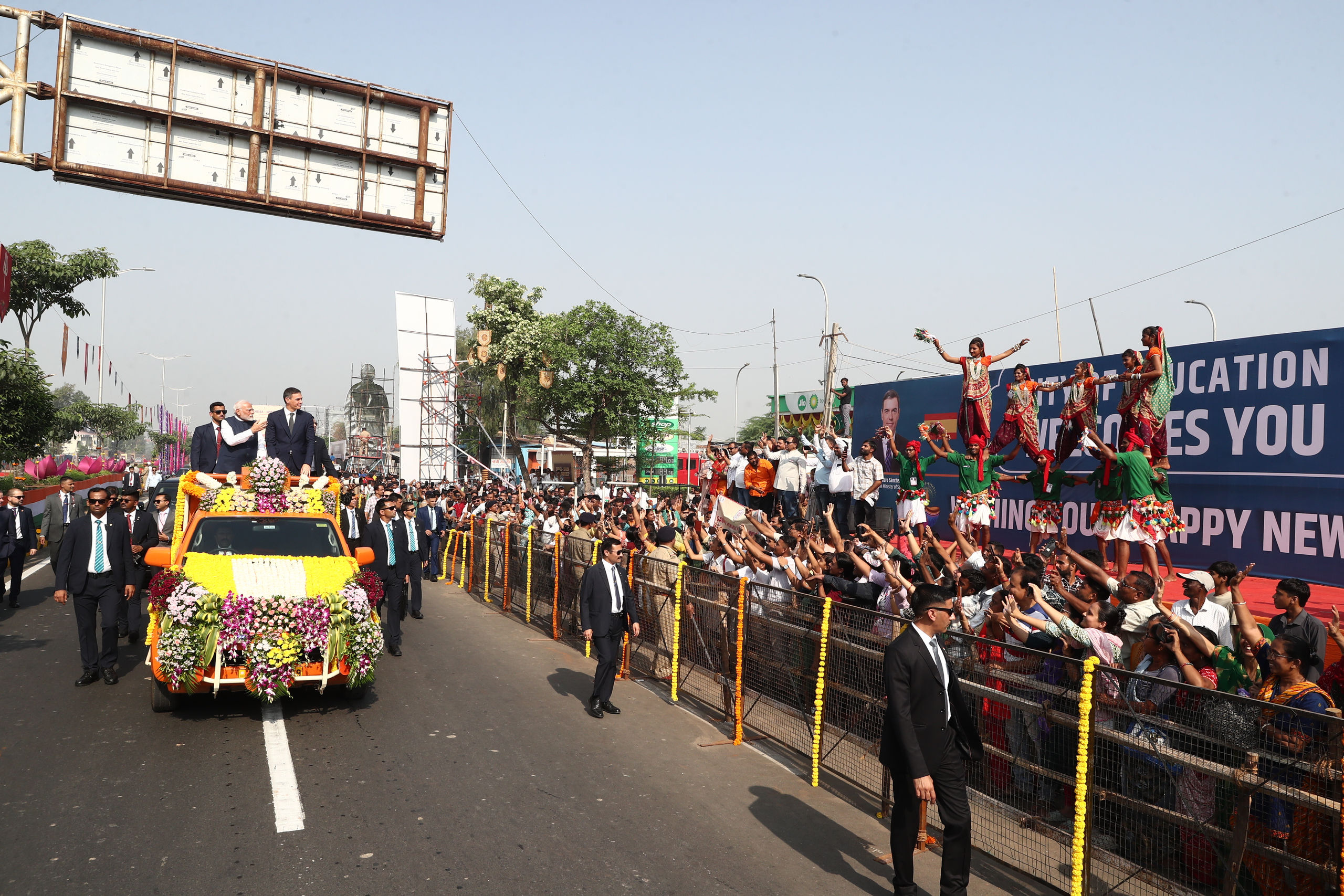 Entre sus compromisos, el presidente tenía prevista una visita a la ciudad de Vadodara, donde el primer ministro indio Narendra Modi le agasajó con un "recorrido de honor", en un coche descubierto y cargado de flores, con una muchedumbre aclamando a ambos desde las calles.