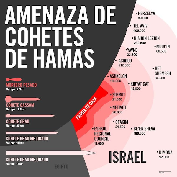 Por otra parte, la peligrosidad del arsenal terrorista ha crecido sensiblemente por la incorporación al mismo de proyectiles de procedencia iraní y rusa. En este gráfico se aprecia cómo las ciudades próximas a la Franja ya no son las únicas susceptibles de ser atacadas. Así, los terroristas tienen ahora a tiro incluso Dimona, sede del programa nuclear israelí.