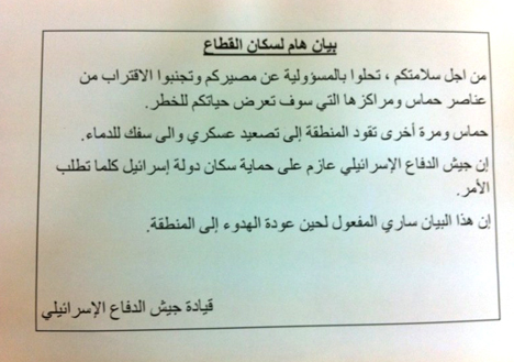 Según informa las Fuerzas de Defensa, desde que comenzara la operación, se ha contactado telefónicamente con los residentes de la Franja de Gaza, advirtiendo de los ataques en la zona. Además, la Fueza Aérea ha lanzado panfletos sobre Gaza advirtiendo a los civiles que se alejen de los "operativos de Hamas".