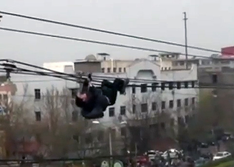 Un borracho se cae de unos cables de teléfono en China