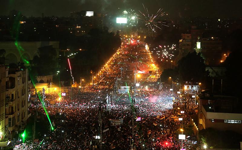 Cientos de miles de personas se concentraron este miércoles en la plaza de Tahrir, foco de las manifestaciones contra el hasta ayer presidente, Mohamed Mursi, celebrando el anuncio del Ejército, que suspendió la Constitución y puso al frente de la Presidencia al Tribunal Constitucional.