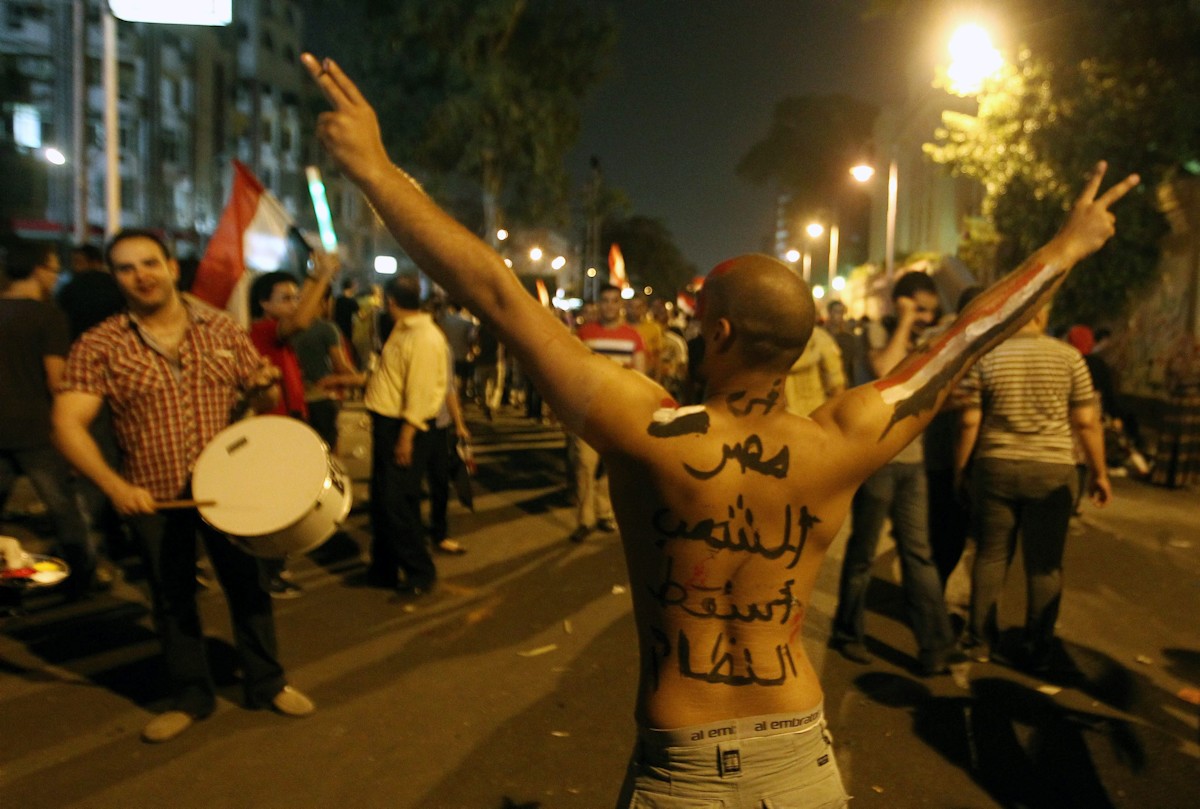 Detalle de un mensaje en la espalda de un egipcio: "Pueblo egipcio-sistema político abajo"