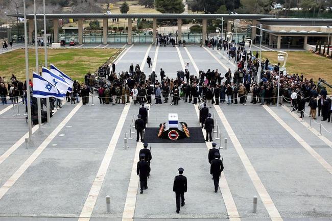 La ceremonia ha comenzado a las doce de la mañana y precede al funeral de estado que tendrá lugar el lunes. Shimon Peres, presidente de Israel, ha dado comienzo a la recepción público colacando una sábana sobre el féretro del ex primer ministro.