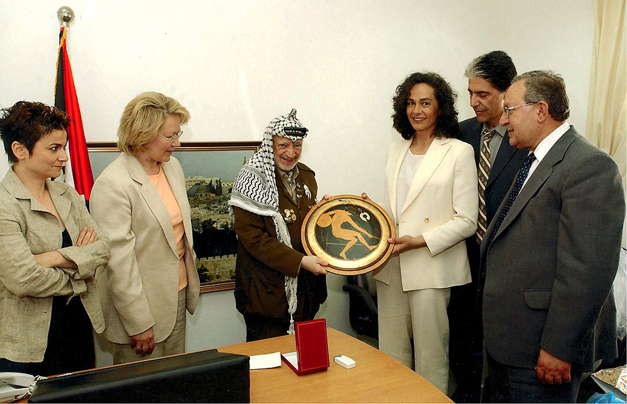 Fotografiarse con Arafat era casi siempre una operación de marketin político rentable para políticos de izquierdas de todo el mundo como puede verse en la imagen en la que recibe el presente de una delegación griega