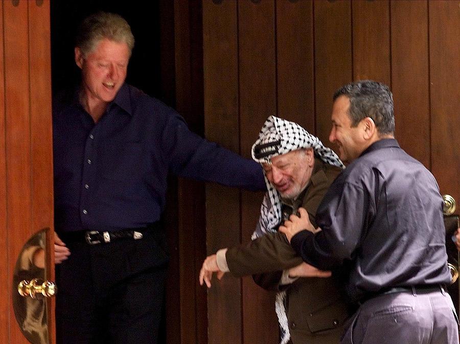 Una imagen muy conocida de Arafat bromeando con Bill Clinton y con el entonces primer ministro israelí Ehud Barak durante las conversaciones de Camp David en el año 2000. La mayor parte de los analistas citan aquel acuerdo como la gran oportunidad perdida de Arafat, que tras negarse a firmarlo impulsó la Segunda Intifada