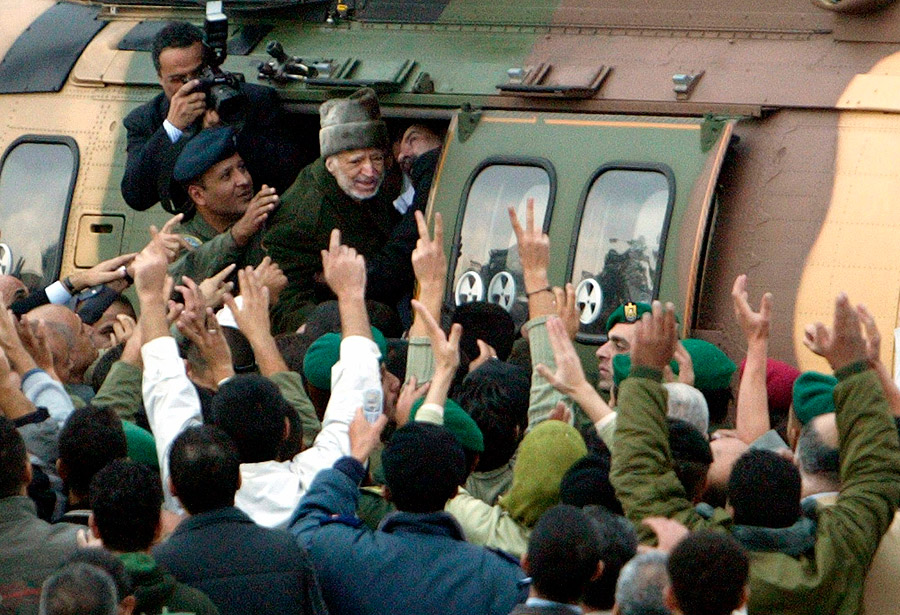 Esta imagen recoge el último momento de Arafat en Ramala el 29 de octubre de 2004, cuando partió en helicóptero rumbo a Francia. Ya no volvió nunca a los territorios de la ANP