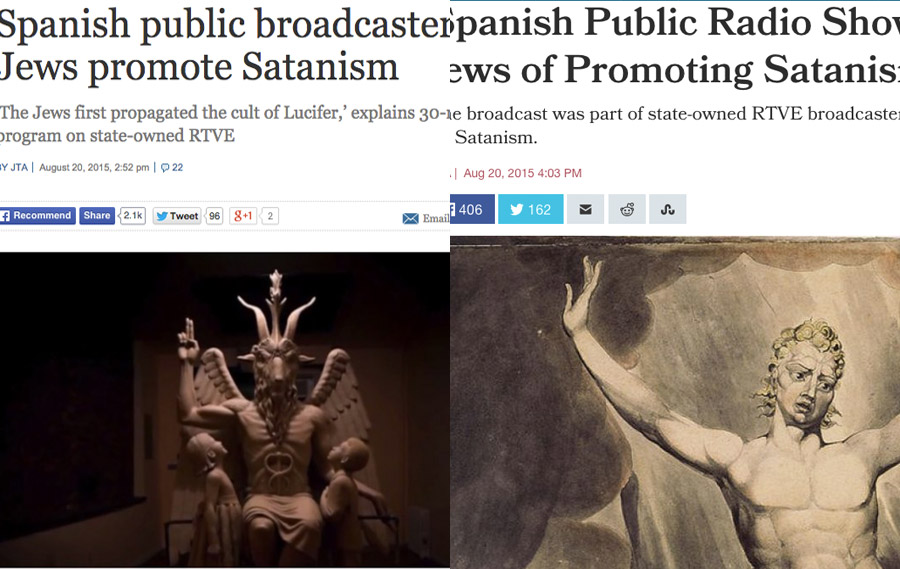Por último, el periódico que podríamos considerar como representante del centrismo en el panorama mediático israelí, Times of Israel, también reproduce el teletipo de la JTA para titular: "Una emisora pública española dice que los judíos promueven el satanismo".