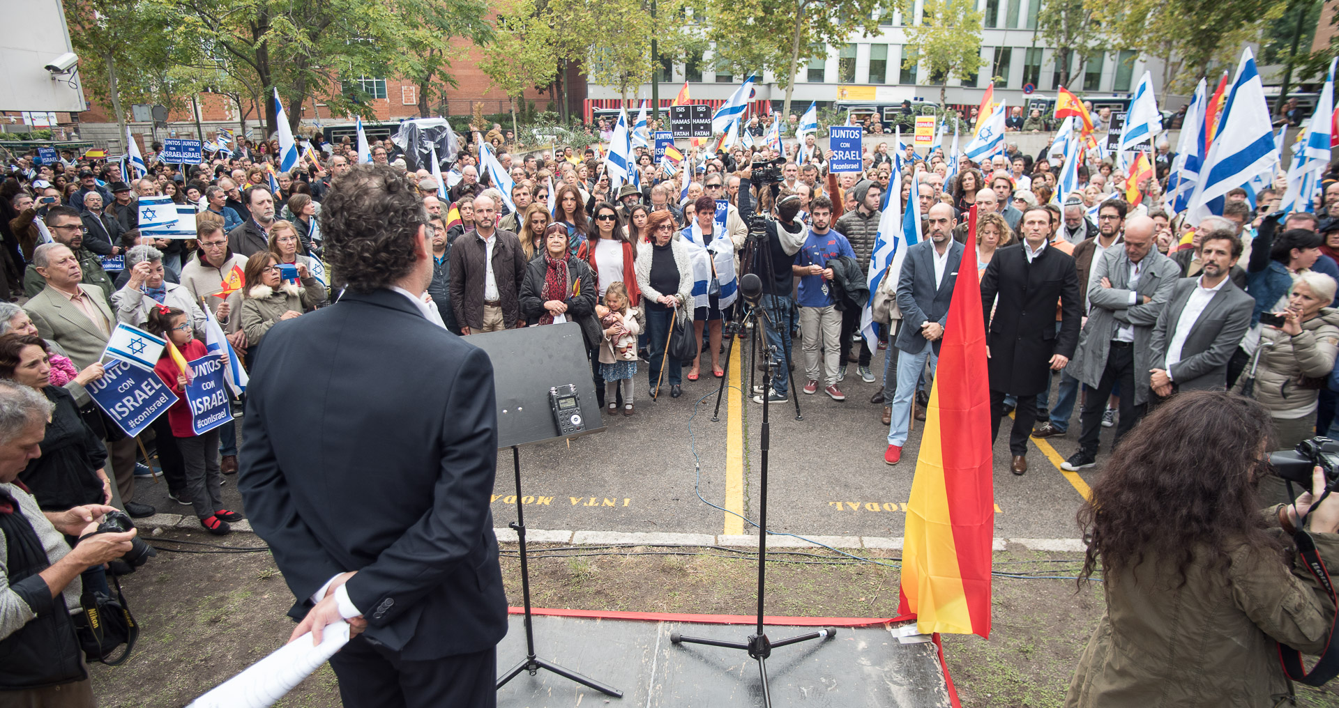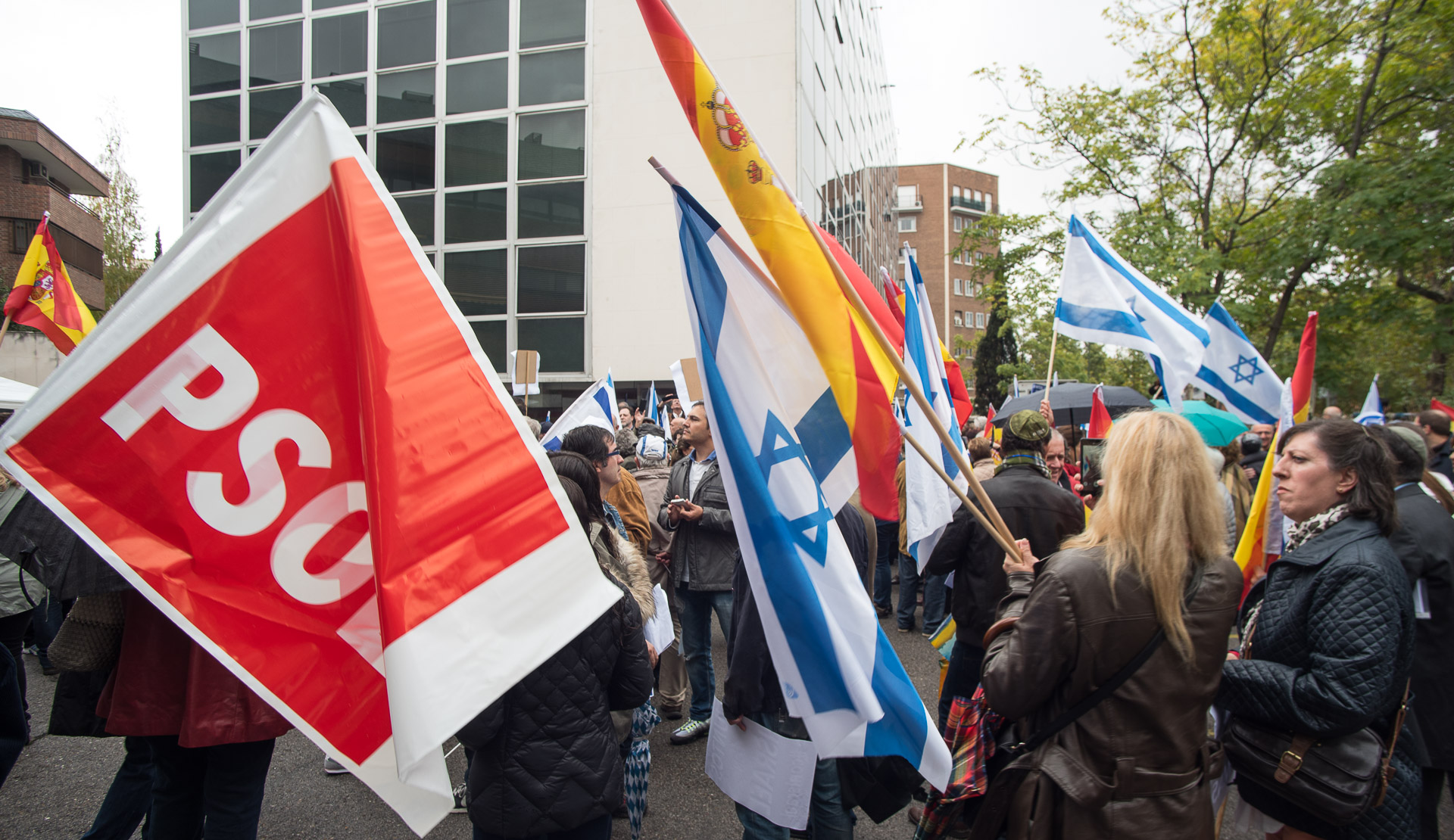 Una bandera del PSOE entre las de Israel y España que abarrotaban el acto
