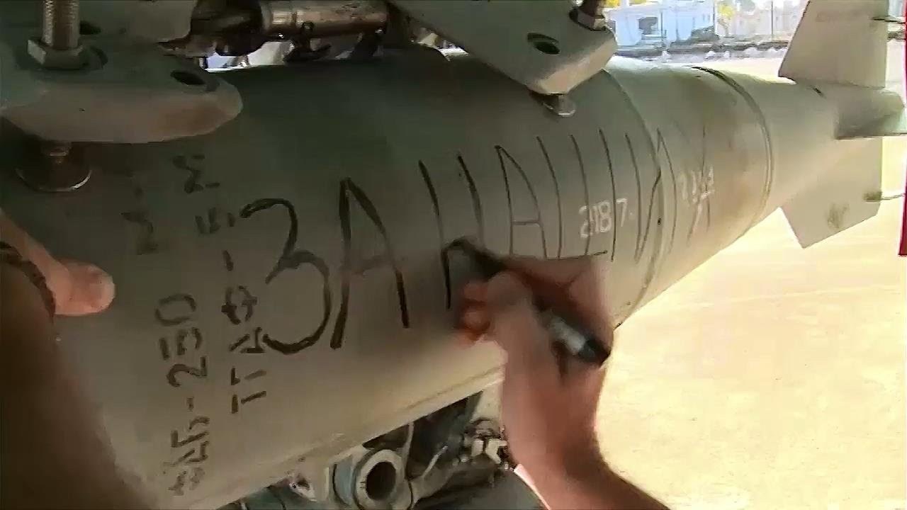 En las imágenes se puede ver cómo un soldado ruso escribe con rotulador negro en los misiles ambos mensajes en cirílico antes de que los cazas despeguen de la base aérea rusa situada cerca de Latakia.