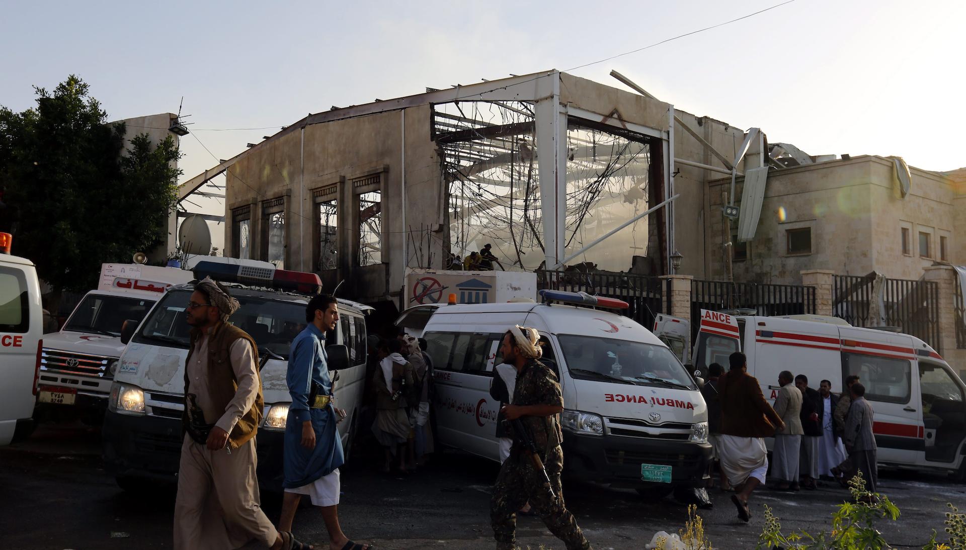 El bombardeo tuvo lugar cuando en torno a un millar de personas expresaban sus condolencias a la familia del ministro rebelde del Interior, Yalal al Ruishan, en un salón de eventos del barrio residencial de Al Yamsín, en el sur de Saná. "El coordinador humanitario Jamie McGoldrick condena inequívocamente este horrible ataque que tuvo lugar en Saná", aseguró la nota, en la que el coordinador mostró sus condolencias a las familias de los fallecidos.