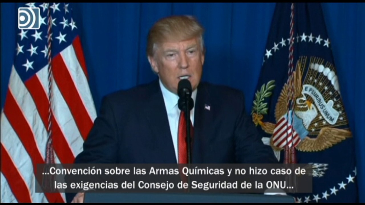 Esta noche ordené un ataque militar dirigida al aeródromo de Siria desde donde se lanzó el ataque químico. Esto es por un interés vital de seguridad nacional de los Estados Unidos para prevenir y disuadir la propagación y el uso de armas químicas mortales.