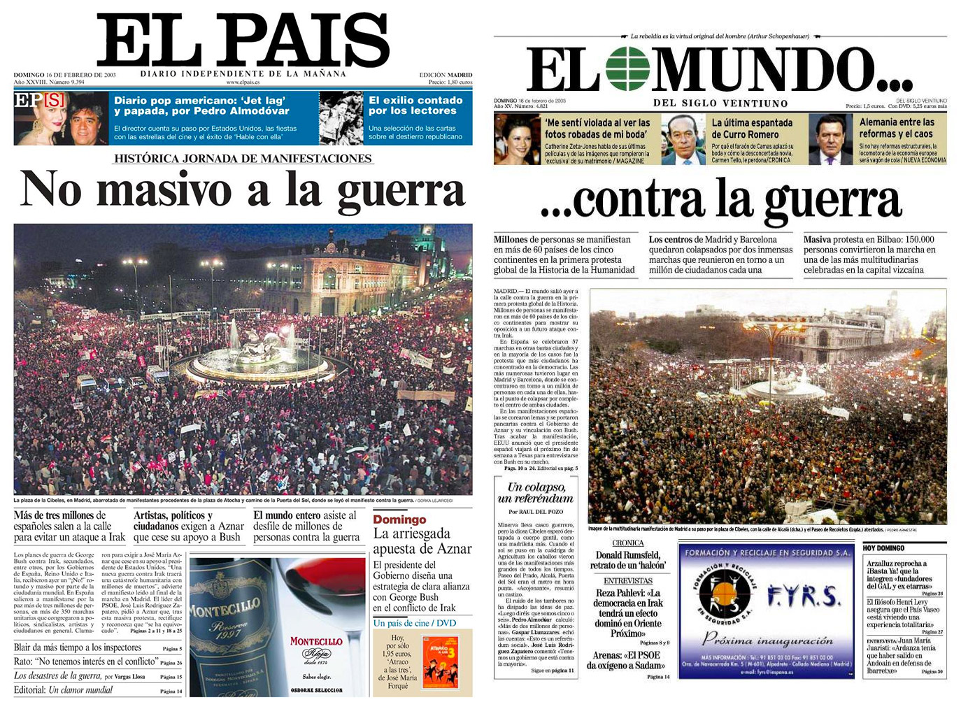 Ya en plena cuenta atrás se convocaron manifestaciones contra la guerra en medio mundo. En España fueron masivas, especialmente en Madrid y Barcelona como recuerdan las portadas del el día siguiente de El País y El Mundo, medios que por cierto se sumaron con entusiasmo al rechazo al conflicto bélico.