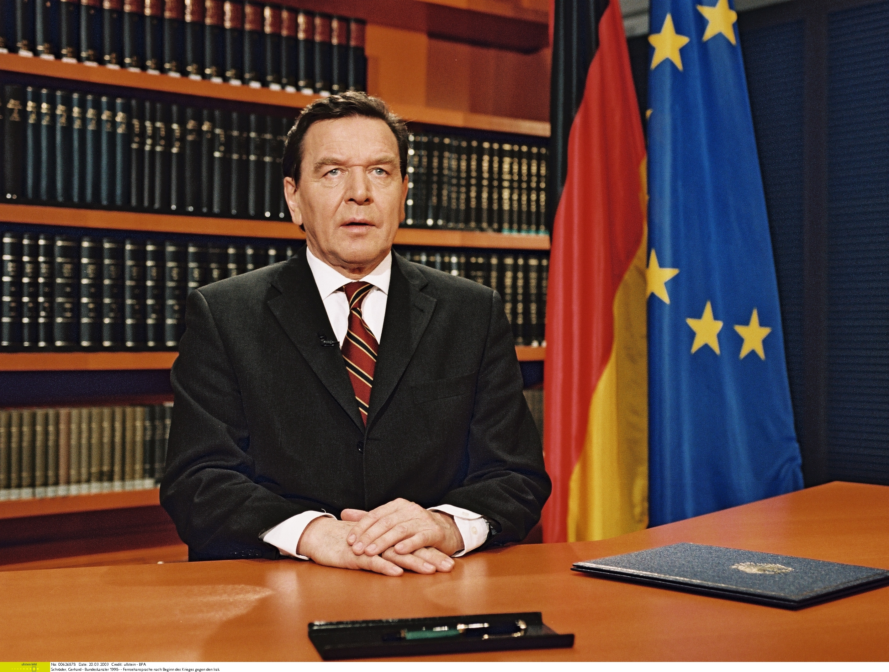 Algunos aliados tradicionales de EEUU dieron la espalda al entonces presidente Bush y plantearon una oposición muy dura encabezada especialmente por Francia -con el liderazgo del presidente Chirac- y Alemania, donde fue el entonces canciller Gerhard Schröder el que encabezó políticamente el asunto. Por supuesto, también se mostraron contrarios países que tradicionalmente se han enfrentado a Estados Unidos como Rusia y China. En la imagen vemos a Schröeder en una de sus comparecencias sobre la guerra.