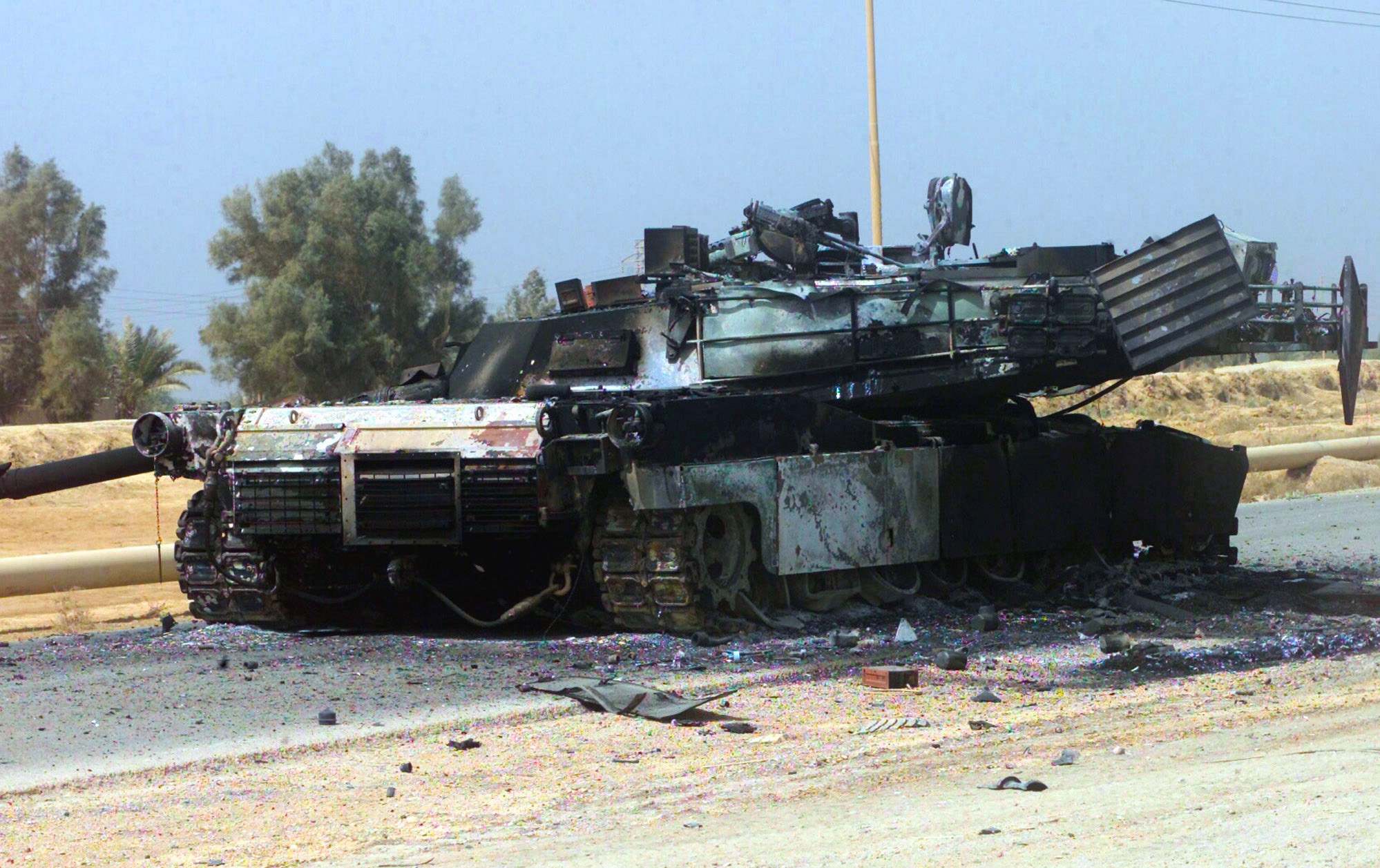 El ejército iraquí no presentó una resistencia muy fuerte como por otra parte cabía esperar. Sin embargo durante las semanas en las que el gobierno de Sadam Hussein aguantó desplazó a perodistas en las que podría mostrar acciones aparentemente victoriosas, del estilo de este M1A1 Abrams americano incendiado en la Route 1 de Irak.