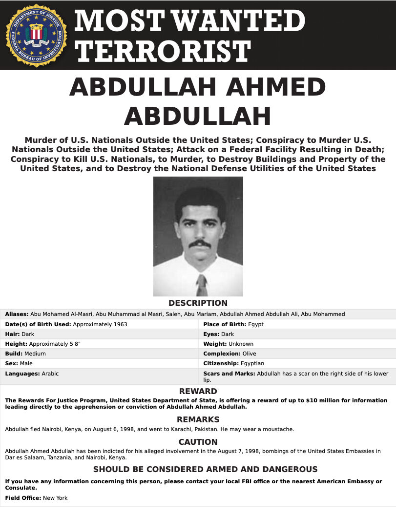 El terrorista, de 58 años, fue parte del grupo fundador de Al Qaeda y se creía que era el número dos de la organización. También se encuentra en la lista de los más buscados por el FBI, ya que, oficialmente ni la organización terrorista, ni ningún Gobierno han reconocido su muerte.