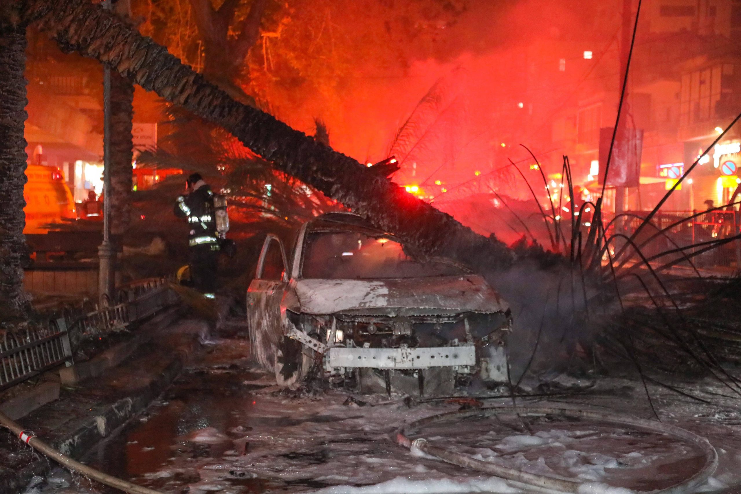 Un vehículo dañado después de que un cohete de la Franja de Gaza explotara en la ciudad israelí de Holon. En el suburbio de Holon, al sur de Tel Aviv, dos personas resultaron gravemente heridas.