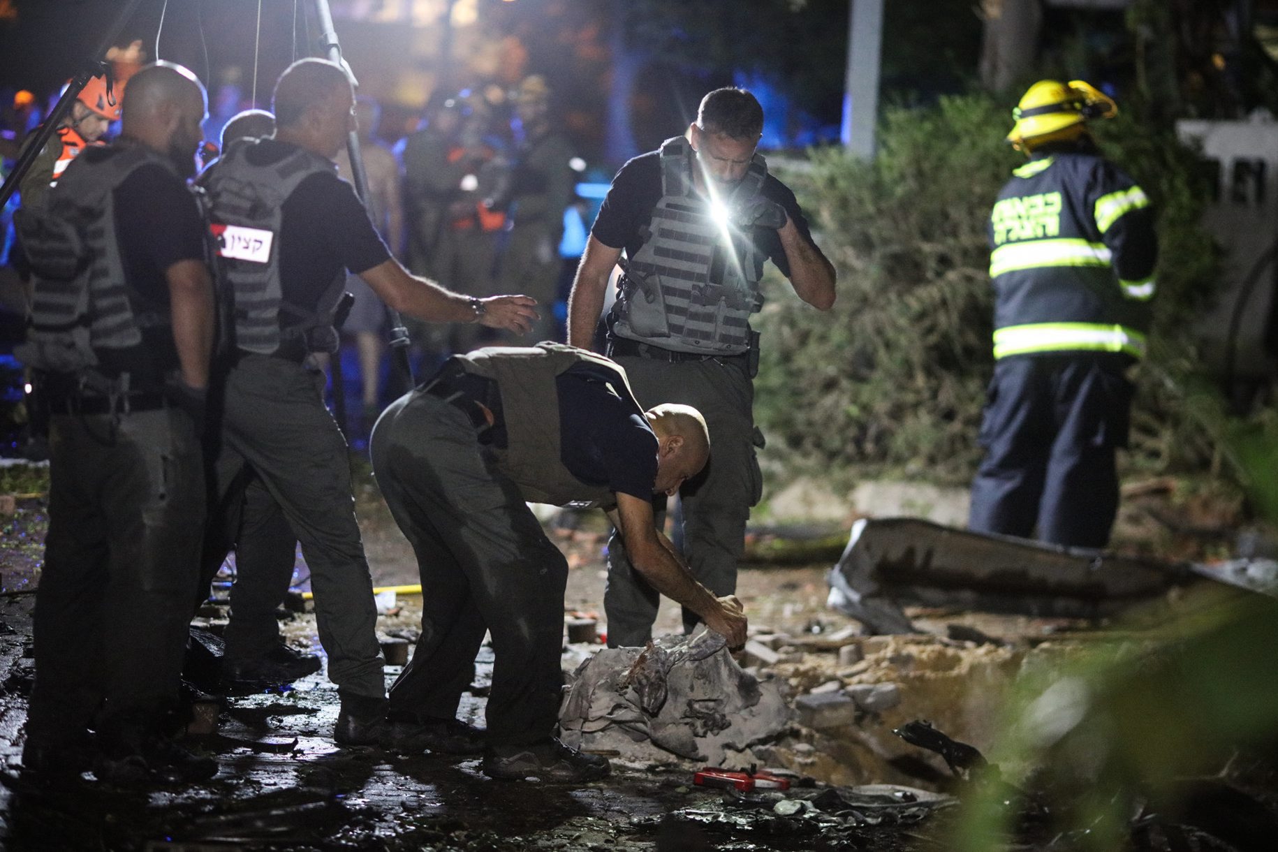 Personal de seguridad y emergencia israelí trabaja en un sitio alcanzado por cohetes disparados por el movimiento islamista palestino Hamas desde Gaza hacia Israel, en la ciudad israelí de Rishon Lezion, al sur de Tel Aviv.