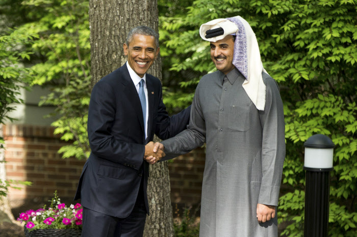 Tamim siempre muestra su cara más amable ante los líderes internacionales. No podía ser menos con el presidente estadounidense Barack Obama, con quien se encontró en el marco del Consejo de Cooperación del Golfo celebrado en Camp David el 14 de mayo de 2015. Es uno de los pocos foros en el exterior en el que el emir apuesta por la vestimenta tradicional.