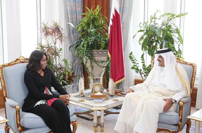 También se reunió unos meses más tarde -el 3 de noviembre de 2015- con la primera dama de los Estados Unidos. Esta vez en Doha y con la mejor de sus sonrisas. Michelle Obama se encontraba de visita en Qatar para participar en la Cumbre Mundial de Innovación para Educación (WISE). Un tema del que tuvieron la oportunidad de conversar durante su encuentro, según informaron las autoridades del país del Golfo Pérsico.