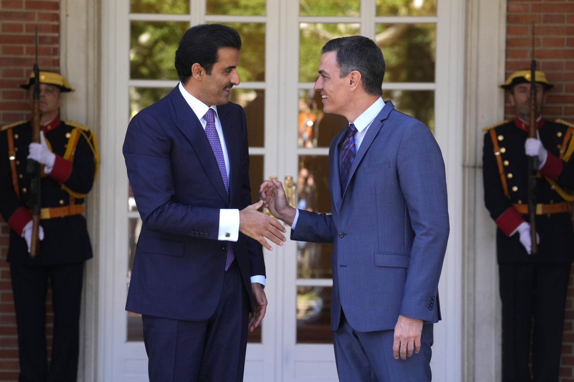 Durante su visita, el emir de Qatar tuvo la oportunidad de encontrarse en varias ocasiones con el presidente del Gobierno español, Pedro Sánchez. En la imagen, el momento en el que el jefe del Ejecutivo le recibe en el palacio de la Moncloa, el 18 de mayo de 2022.