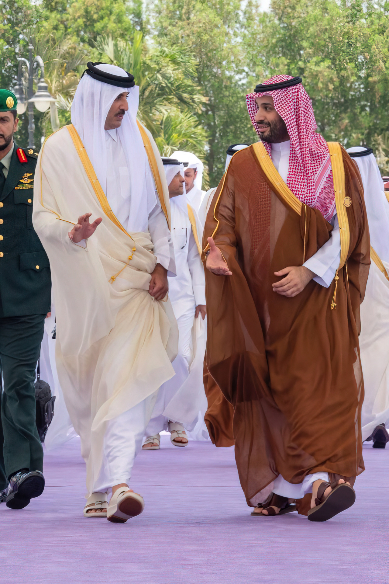 De vuelta a la península arábiga, Tamim se calza de nuevo el turbante (árabe) o Keffiyeh. En la fotografía, vemos al príncipe heredero de Arabia Saudí, Mohammed bin Salman Al Saud, recibiendo al emir de Qatar, para acudir a la 'Cumbre de Seguridad y Desarrollo' celebrada en Jeddah el 16 de julio de 2022.