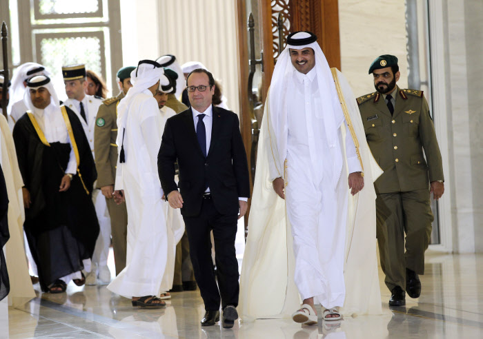 Cuando la cita es en su territorio, la cosa cambia. Tamim siempre recibe a sus invitados con la vestimenta típica del país, como hizo el 4 de mayo de 2015 para encontrarse con el presidente francés, Francois Hollande, en el Emiri Diwan Palace de Doha.