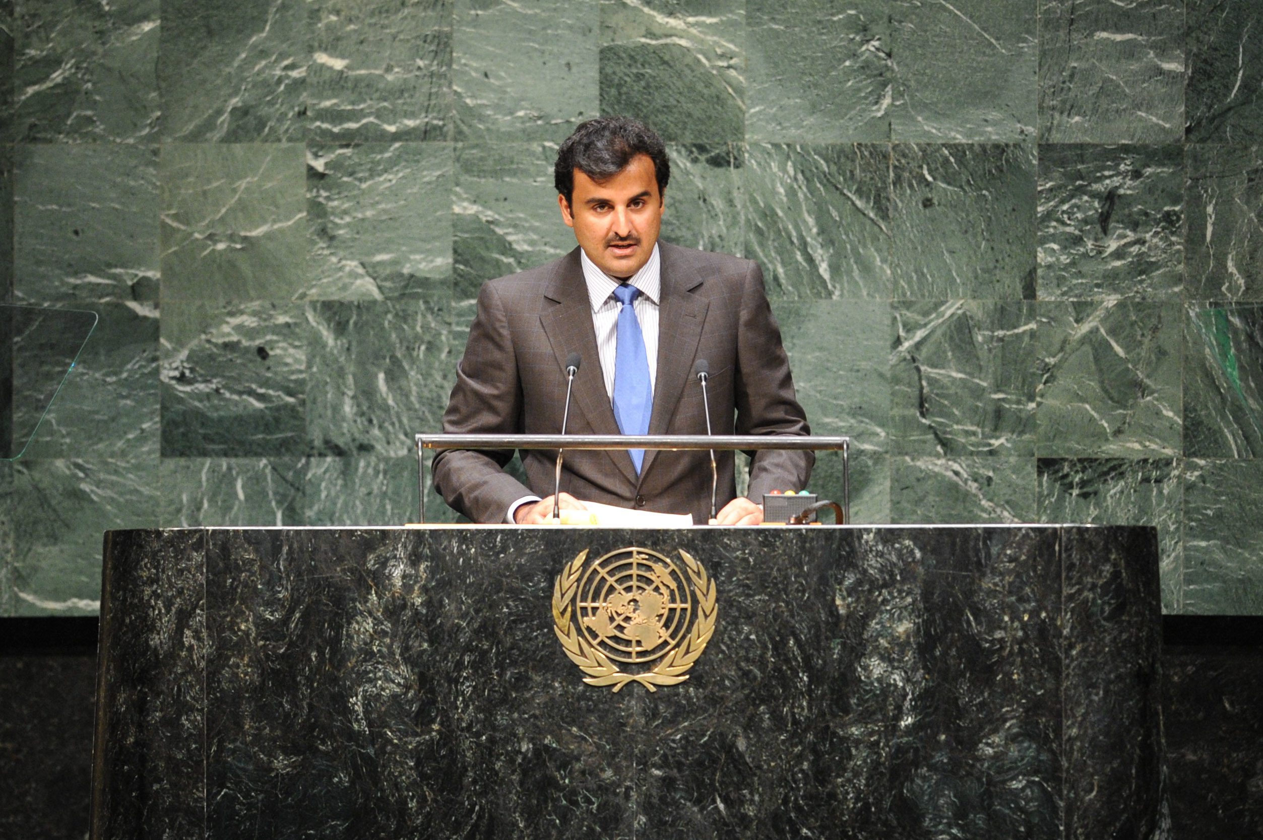 Cuando el jeque Tamim sale de su pequeño emirato, saca a relucir su cara más occidental. Deja el thaub colgado en casa -en palacio, en este caso- y se enfunda uno de sus muchos trajes de chaqueta. En la imagen, le vemos durante su discurso en la 69ª Asamblea General de las Naciones Unidas, en la sede de la ONU en Nueva York, el 24 de septiembre de 2014.