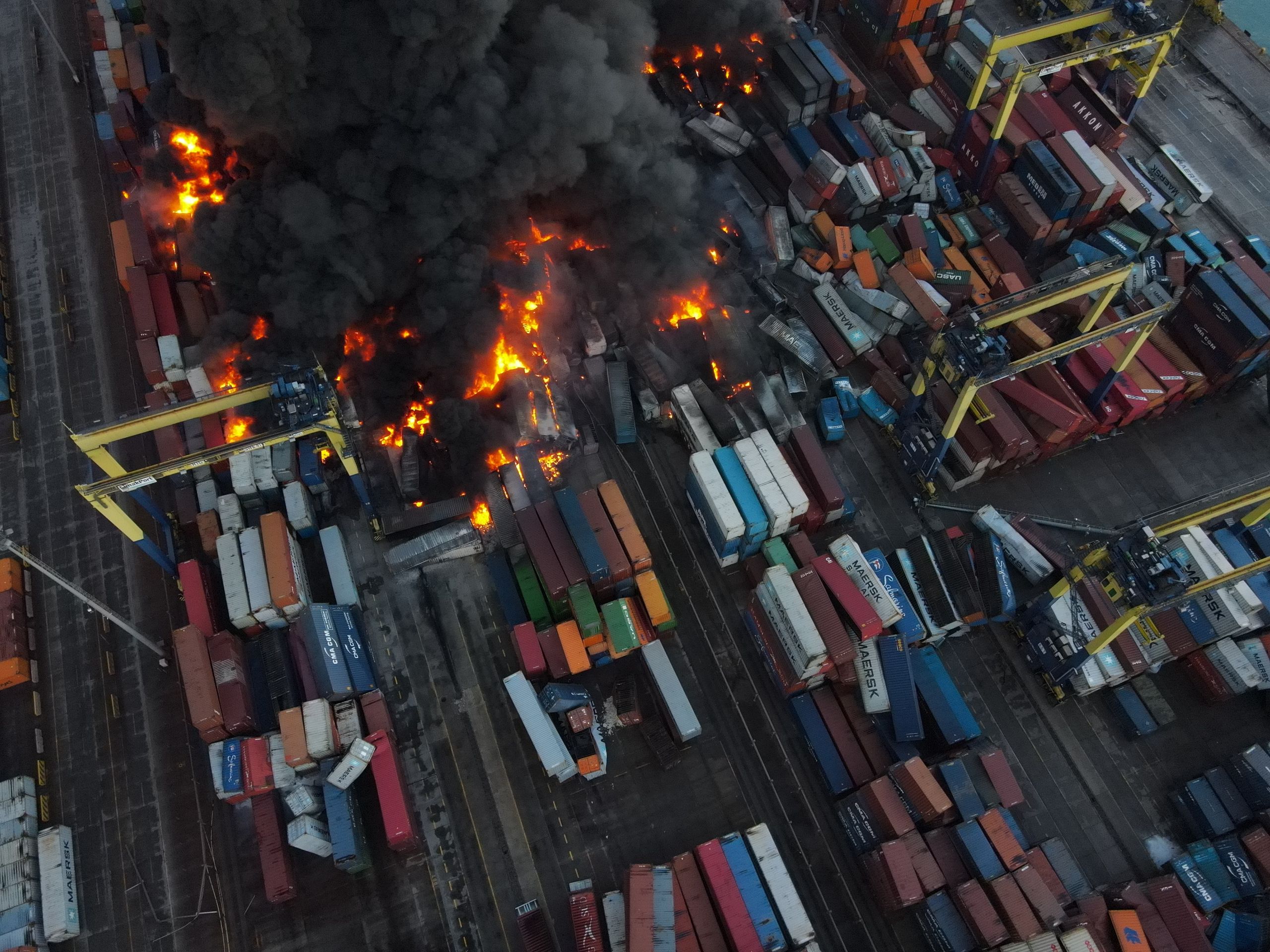 Contenedores ardiendo en un puerto tras los terremotos de Turquía.