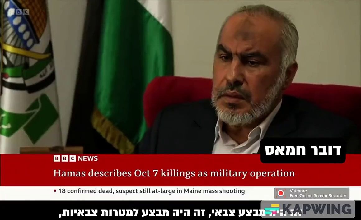 A pesar de las imágenes, muchas de ellas grabadas por los propios terroristas, Hamad intentó vender en la entrevista con la televisión pública británica que no hubo orden alguna de "matar civiles" en el día en que más de 1400 israelíes fueron asesinados y más de 200 secuestrados, muchos de ellos ancianos y niños.