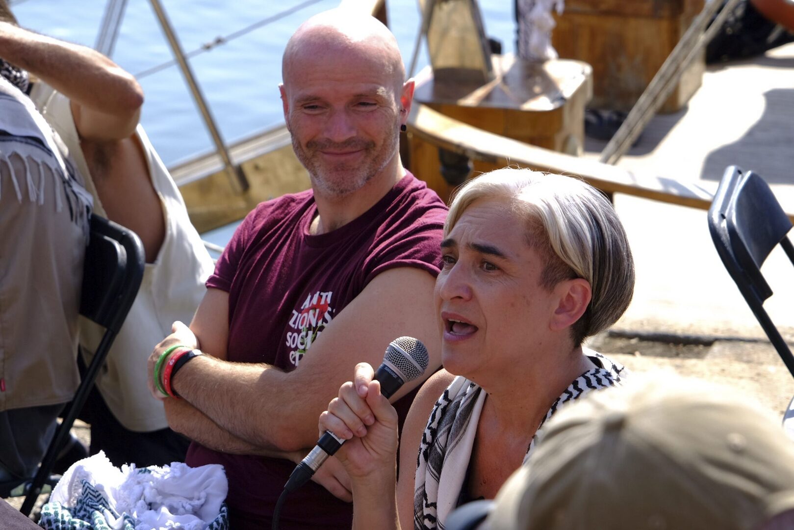 A ritmo de batucada y coreando "Free, free Palestine, Free, free Palestine, Free, free Palestine", así hasta el aburrimiento, han cruzado el mar Mediterráneo. A la ex alcaldesa de Barcelona, Ada Colau, se le ha hecho largo: "Estamos tardando más de lo que quisiéramos". Y ha contado que sólo lo ha soportado gracias "a los abrazos" y porque "siento dentro de mí que es un punto de inflexión".
