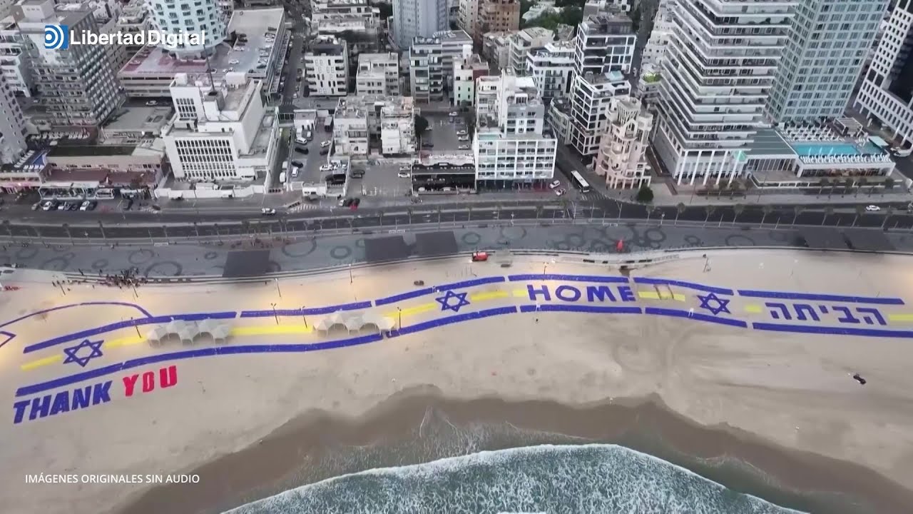 Israel recibe a Trump, con un mensaje en la playa de Tel Aviv. Aparece su silueta acompañada del texto en inglés con las palabras "gracias" y "hogar".
