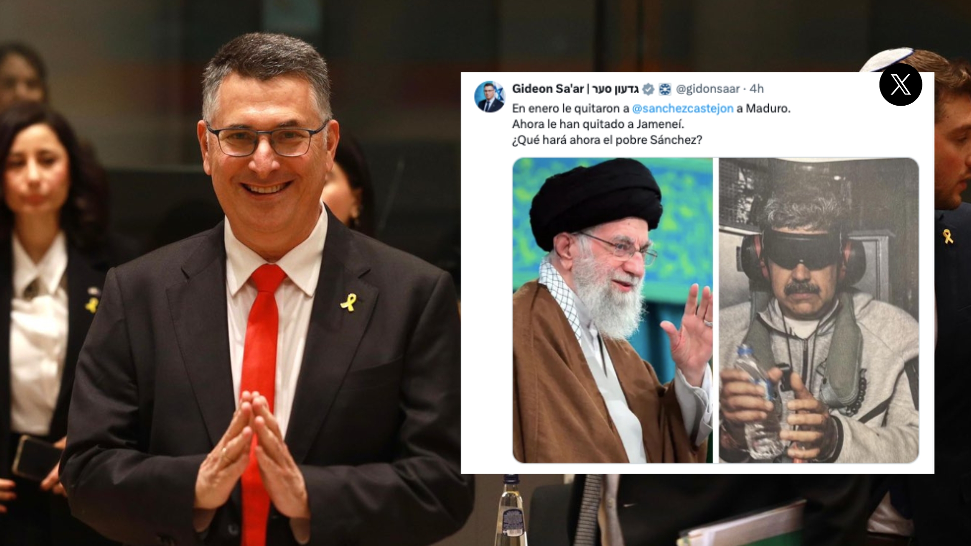 A través de la red social X, Saar se preguntó este martes qué hará ahora "el pobre Sánchez" después de que "le hayan quitado a Alí Jameneí", muerto en un ataque en Irán el pasado sábado. El mensaje iba acompañado de una imagen del líder iraní junto a otra del exmandatario venezolano Nicolás Maduro, al que Estados Unidos capturó en enero. "En enero le quitaron a @sanchezcastejon a Maduro. Ahora le han quitado a Jameneí. ¿Qué hará ahora el pobre Sánchez?", escribió el jefe de la diplomacia israelí.