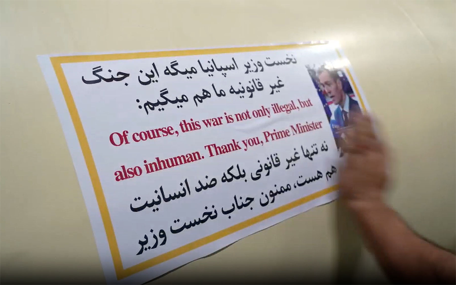 "Por supuesto, esta guerra no es sólo ilegal también es inhumana. Gracias primer ministro", es el mensaje que se puede leer en la pegatina, escrito en inglés, en persa y también en árabe.
