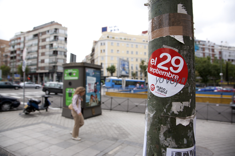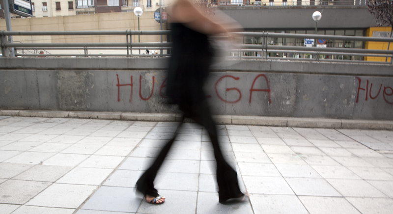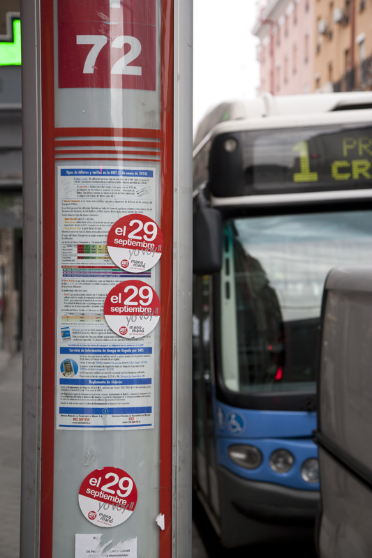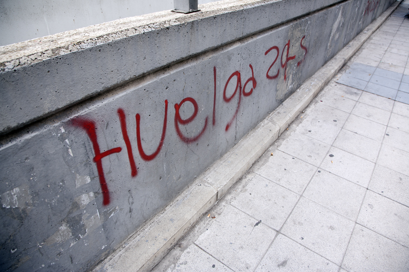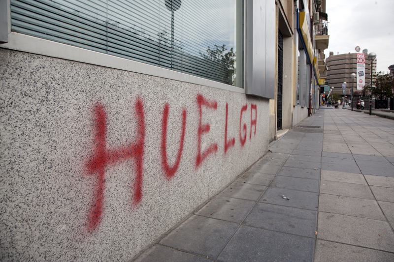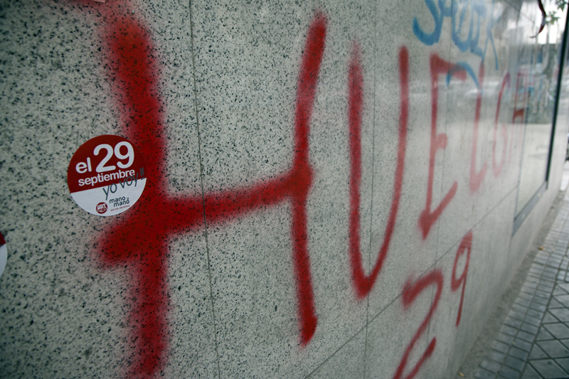 La huelga general empieza a sentirse en las paredes de Madrid. Pintadas, pegatinas y carteles proliferan por las paredes y en las estaciones de Metro se reparten panfletos publicitarios no muy diferentes a los de las academias de idiomas.