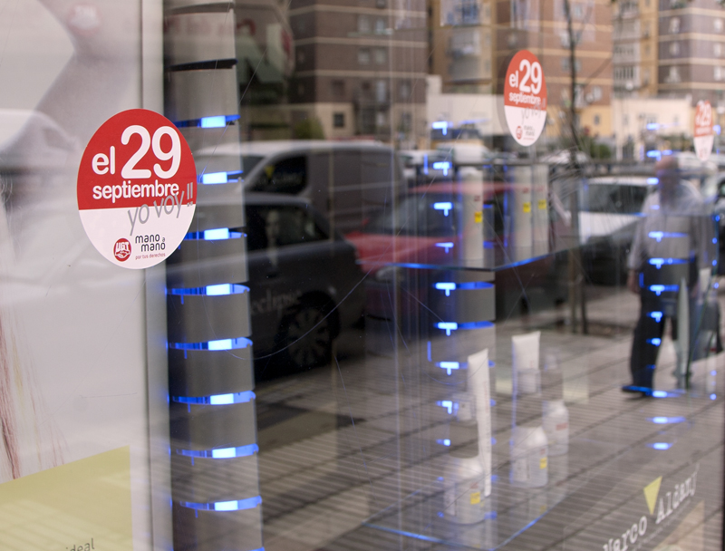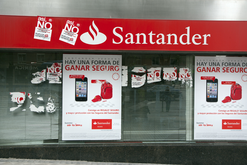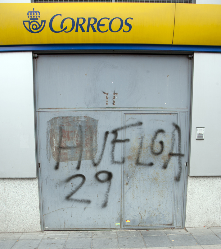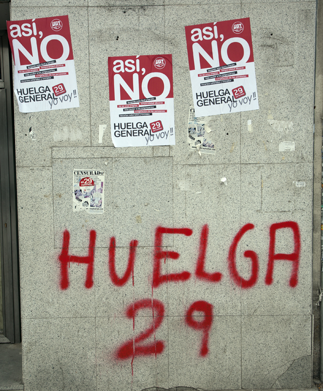 Madrid está empapelado de carteles y pegatinas llamando a la huelga general del próximo día 29. En toda la capital no queda una sola entidad bancaria sin su correspondiente dotación de pegatinas y carteles pegados con cepillo y cola, como en los viejos tiempos.