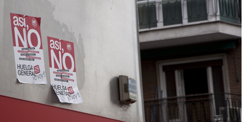 Las inmediaciones de las sedes de CCOO y UGT son las más afectadas. Los sindicatos ya no son lo que eran y sus pegadores de carteles parecen renuentes a alejarse demasiado de la sede para promocionar la huelga