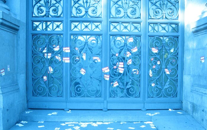 Puerta del Banco de España en la plaza de Cibeles en Madrid.