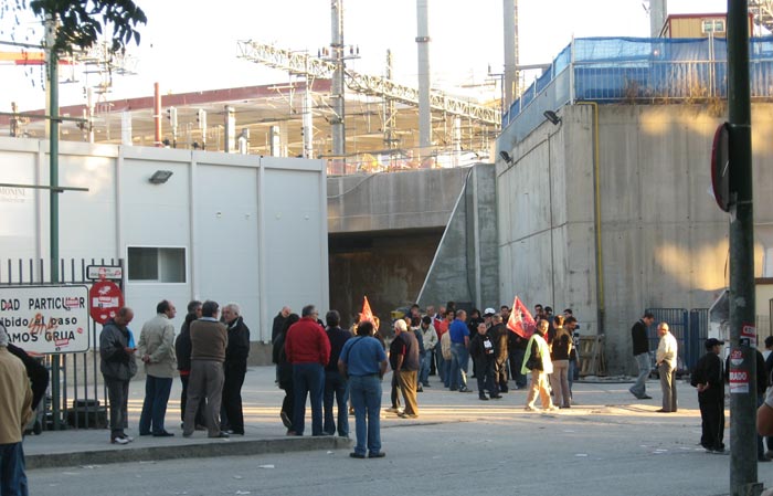 Piquete en la entrada a las obras del AVE en la estación de Atocha de Madrid.