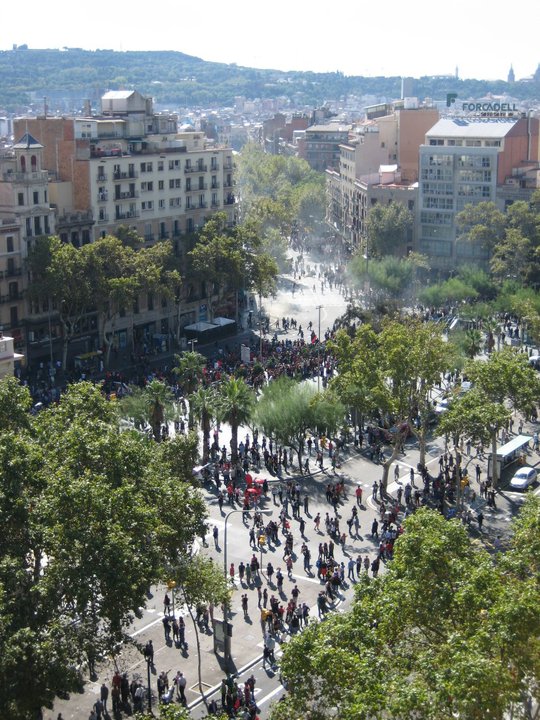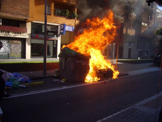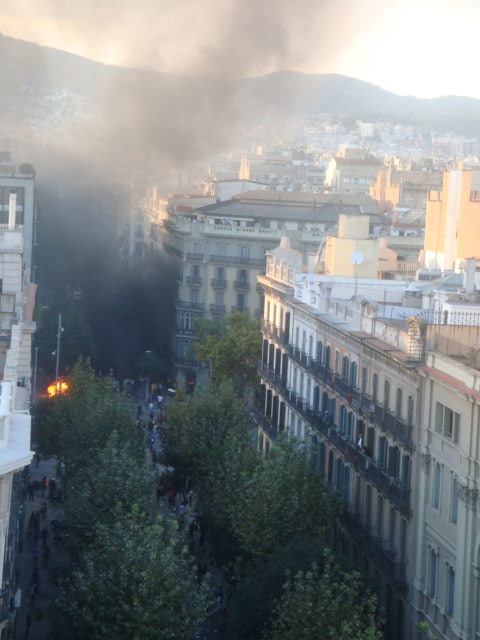 Quema de contenedores en la confluencia de la Gran Vía esquina con Pau Claris en Barcelona, junto a la humareda levantada.