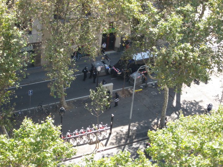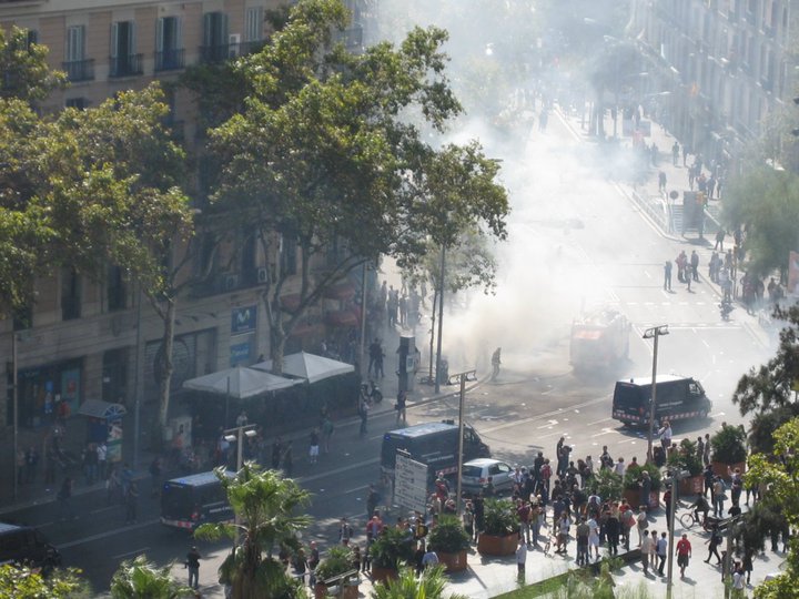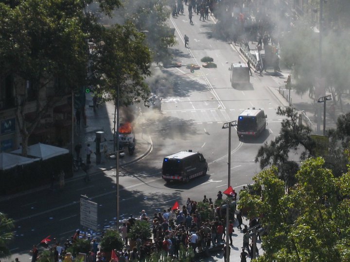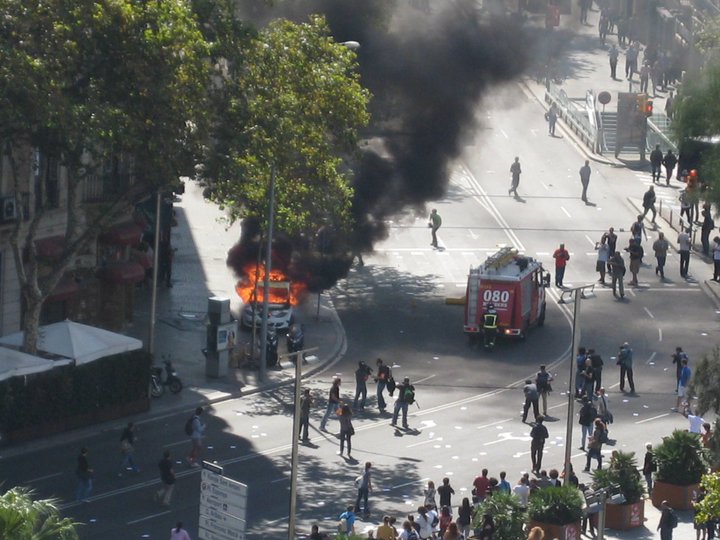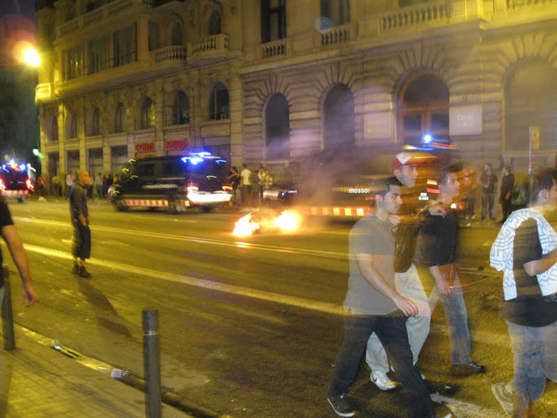 La plaza de la Universidad de Barcelona, los disturbios y un coche de la guardia urbana en llamas.