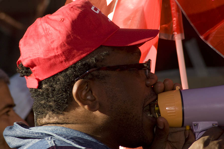 El entusiasta participante en la protesta parecía entonar el himno obrero "A las mariscadas"