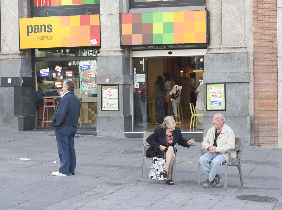 Una pareja de ancianos, tranquilamente sentados ante un establecimiento que, como la mayoría, estaba abierto