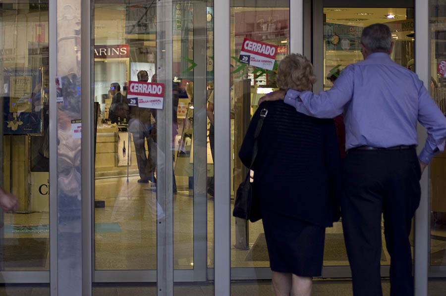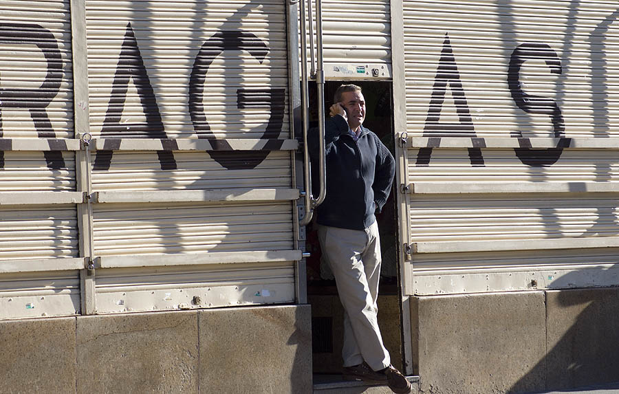 Un comerciante de Sol, esperando al paso del "megapiquete" para abrir su tienda