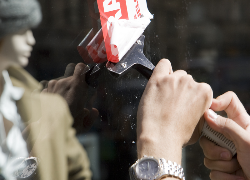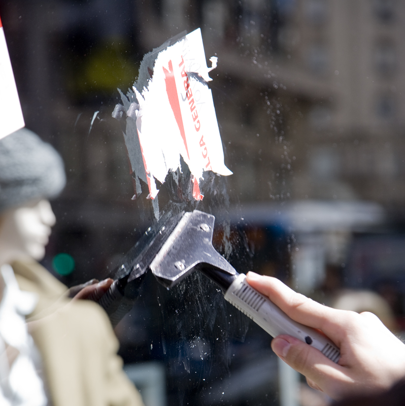 El laborioso trabajo de quitar la propaganda sindical fue ayer lo habitual en comercios de toda España.