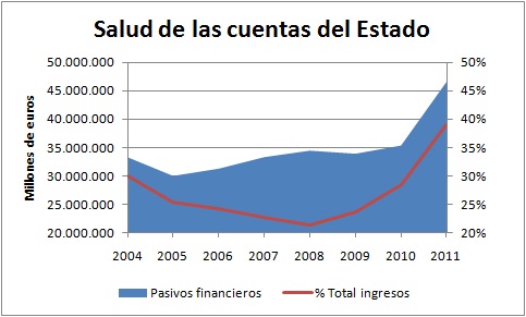 En 2011 destinaremos más de 45.000 millones de euros simplemente a pagar parte de los intereses y de la deuda que hemos acumulado hasta la fecha. ¿Son 45.000 millones mucho dinero? Bueno, valórelo usted mismo: 45.000 millones de euros es el 22% de todo el gasto del Estado y equivale aproximadamente a toda la recaudación por IVA y Sociedades en 2009. Pero mi dato preferido, por aterrador, es éste: el 40% de toda la recaudación prevista para 2011 –una recaudación bastante inflada por absurdas previsiones de crecimiento, por cierto– se la comerán nuestros gastos financieros.